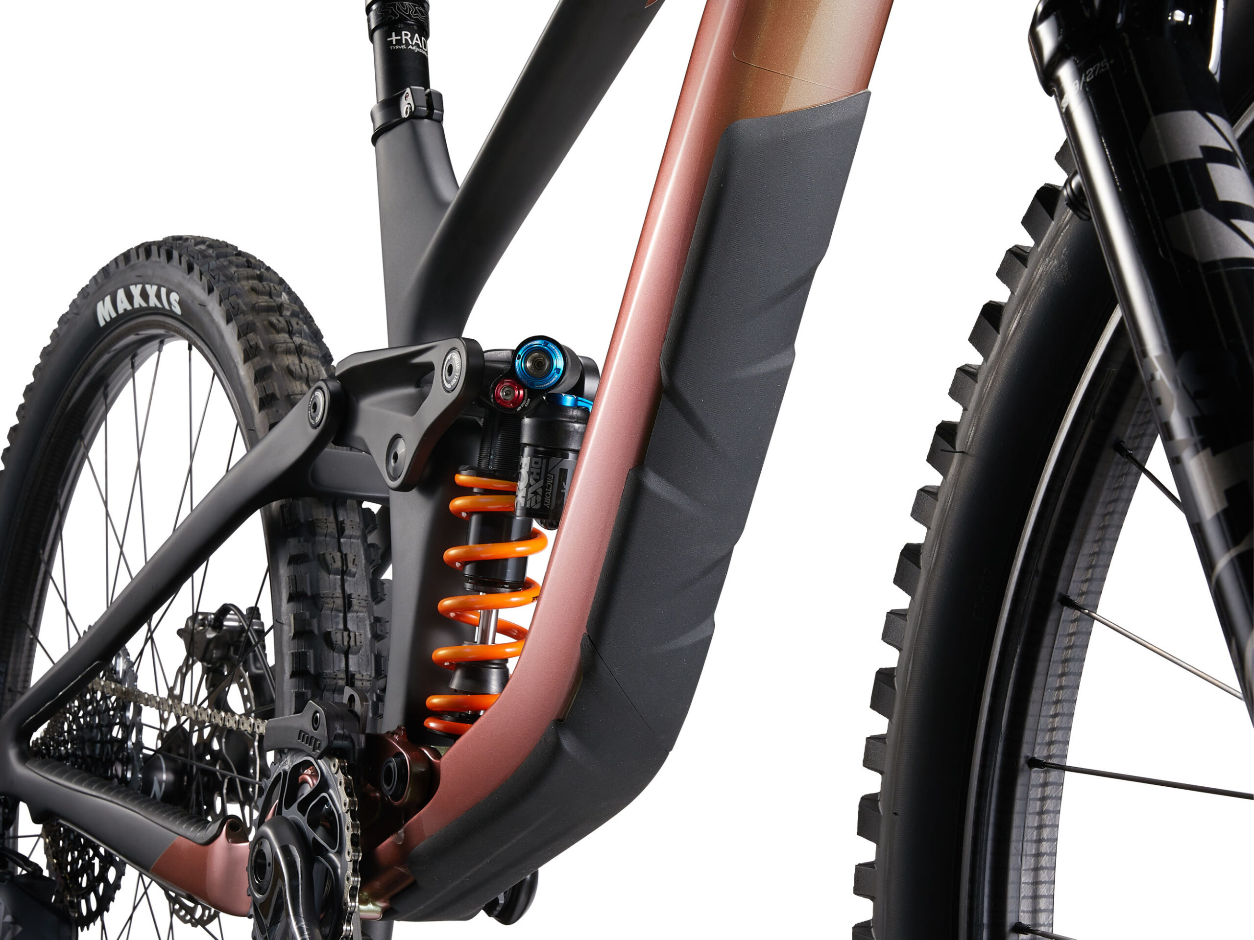 Tubeless prepared, 2.5″ max tyre size, 36t max chainring size, MRP AMG chain guide, 3M tailgate protector